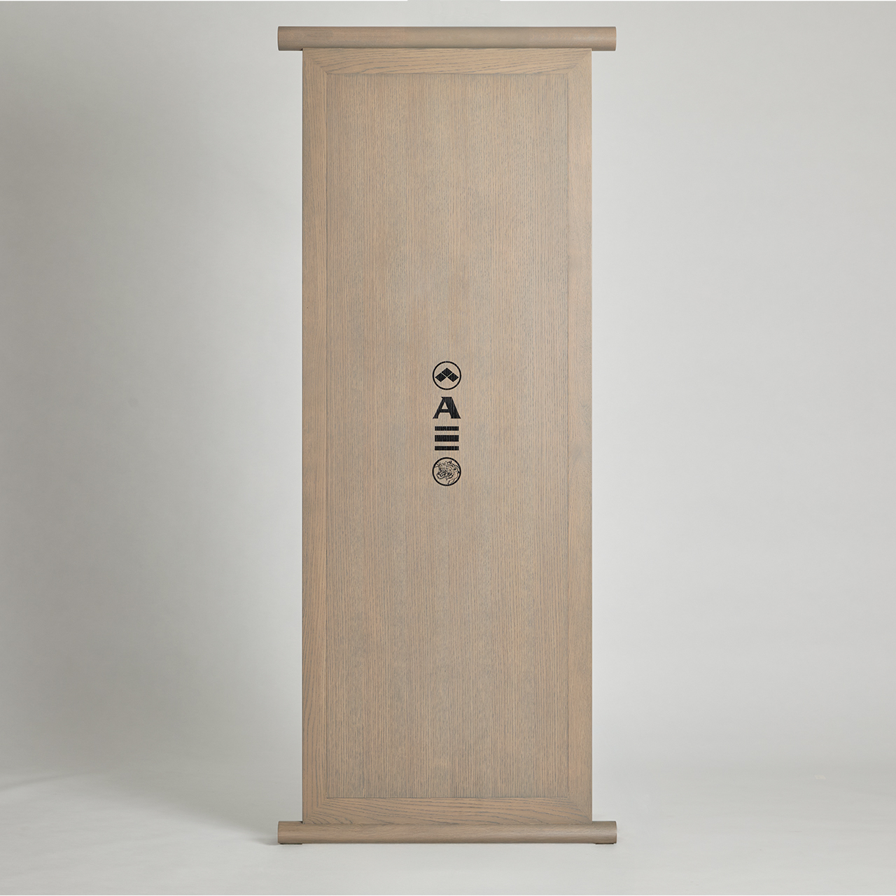 dark walnut, greige oak, glass